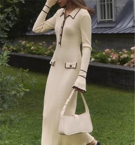 Women Autumn Winter Elegant Knitted Long Ruffles Dressres High Waist Buttons Turn-Down Collar Sweater Dresses