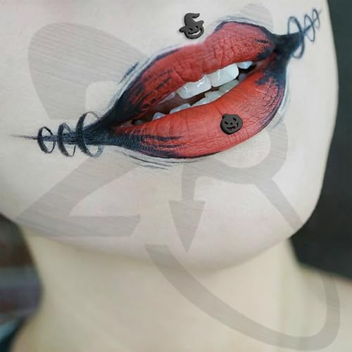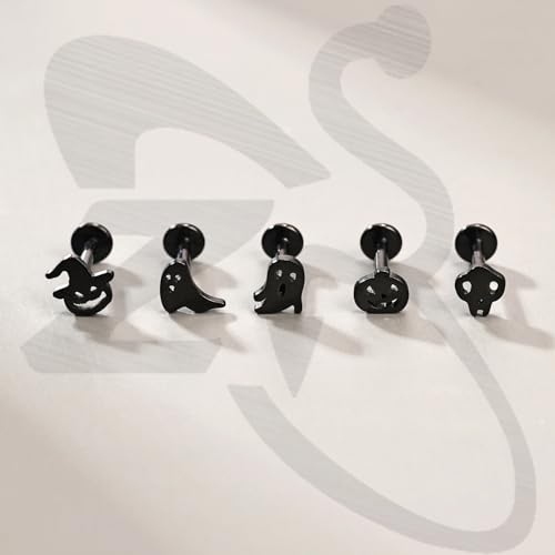 ZS 9Pcs 16G Halloween Lip Labret Studs, Stainless Steel Internally Threaded Jewelry for Conch Medusa Piercing, Black Bat Skull Ghost Forward Helix Tragus Earring for Women Men