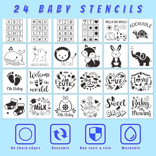 • Baby Shower Game Set: you will grab one baby shower game sign measuring 5 x 8 x 3 inches, 20 white bibs measuring 7 x 7 inches, 9 jumpsuits in three sizes for 0-3 months, 3-6 months, 6-9 months, 24 baby shower stencils measuring 4 x 4 inches in each, and 20 fabric markers in 20 colors; The diversity and rich quantities can meet your needs