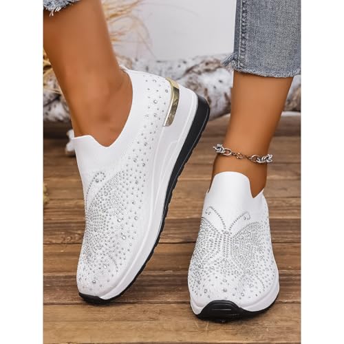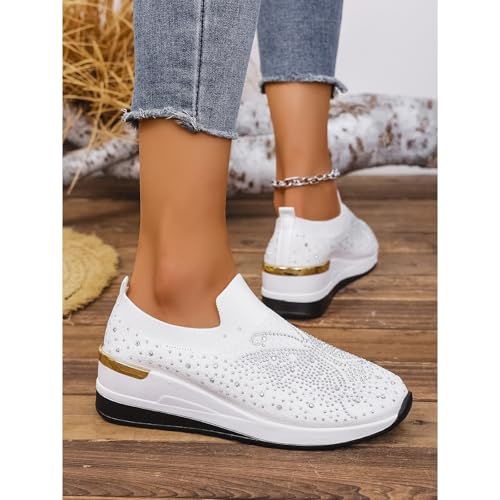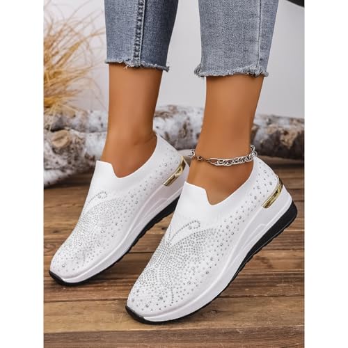 Sole material: RubberClosure type: Pull-OnWater resistance level: Not Water Resistant【Unique Design】supreme elastic mesh knit upper with sparkly rhinestone embellishment,fashionable and breathable,women's glitter sneakers【Super Convenient】Classic Women's rhinestone mesh slip on walking shoes design with elastic shoe mouth, convenient for you to put on and take off.There is enough space in the forefoot of the shoe, you will not feel narrow when you wear it【Platform Wedge Design】 The contemporary wedge heel provides subtle height and support, making these slip-on wedge sneakers both fashionable and orthopedic-friendly,sparkly trainers for women【Occasions】They suitable for working, beach, shopping, vacation, dating, walking, party, club, office,travel, driving, holiday, wedding, daily wear and so on, Women's glitter sparkly fashion sneakers【All-Match】All year round shoes styles, go well with jeans ,shorts ,skirts ,dresses,etc, bling sneakers Perfect for everyday use. High quality materials and excellent craftsmanship ensure long-lasting durability.