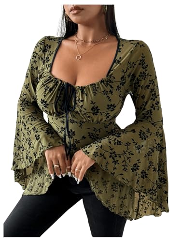 Why Choose SweatyRocks Women's Plus Size Ruched Long Sleeve Mesh Top Floral Bell Sleeve Going Out Shirt?