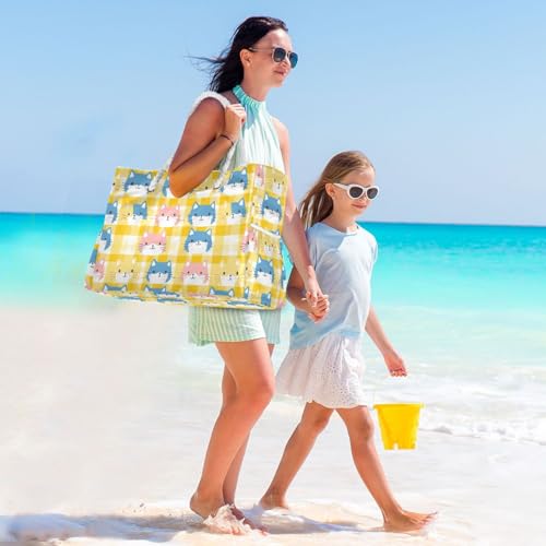popular ! Yellow Colorful Cats Sturdy Beach Bags And Totes with side pocketes Large Beach Bags with zippered pockets