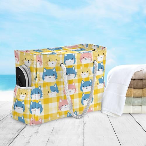 Yellow Colorful Cats Sturdy Beach Bags And Totes with side pocketes Large Beach Bags with zippered pockets 1
