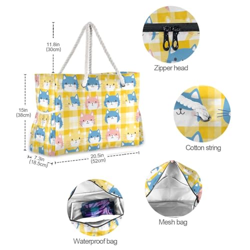 Yellow Colorful Cats Sturdy Beach Bags And Totes with side pocketes Large Beach Bags with zippered pockets 5