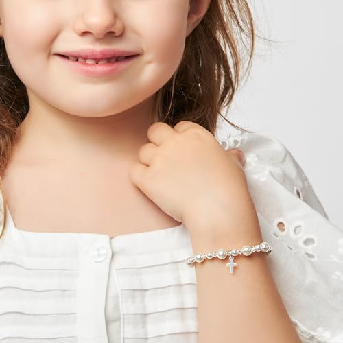 Pearl Bracelets for Girls, Sterling Silver Cross Charm, Baptism Gifts for Girl, Baby Bracelet with Simulated White Pearls and Crystals, Girls Jewelry Birthday Gift 6