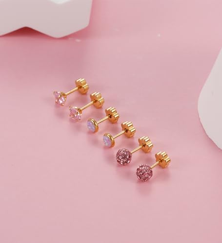 4Pairs Hypoallergenic Flat Back Earrings for Women 14K Gold Cartilage Earring for Sensitive Skin Star Heart Opal Screw Back Nap Earrings Gold Pink CZ 3