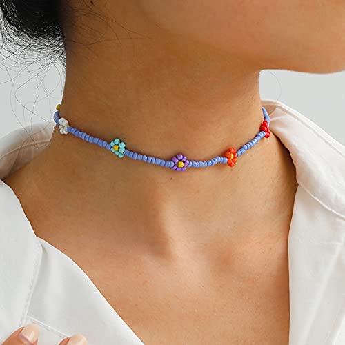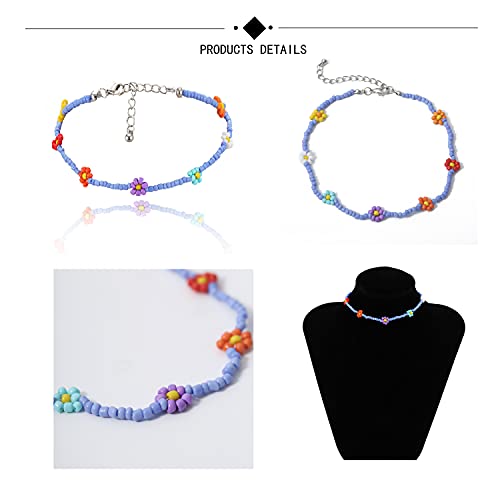 Bohemian Colorful Handmade Tiny Disc Beaded Choker Daisy Flower Necklaces Bracelets Boho Sunflower Seeds Chain Collar for Women Girls Summer Delicate Holiday Jewelry-G Bluish Violet Colorful Set 6