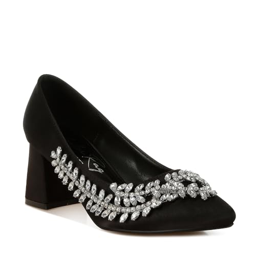 - Type: Pumps Upper Material: Satin Outer Sole: TPR Closed Pointed Toe Diamante Brooch Embellishment Block Heels snug Cushion Insole Heel Height: 2.5 inches SH5118
