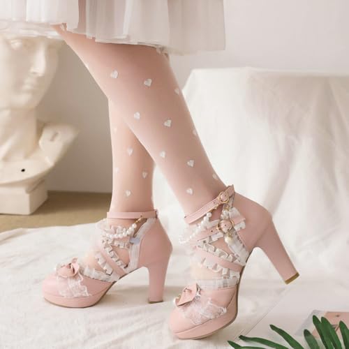 Parisuit Womens Cute Kawaii Mary Jane Pearl Bow Lolita Cosplay Shoes Lace Heels Chunky Platform Pumps with Ankle Strap Round Toe Dress Shoes 5