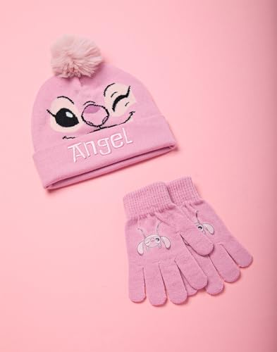 Disney Lilo & Stitch Girls Beanie Hat & Gloves Set | Pink Knitted Winter Hat with Angel Character Face | Kids One Size Pom Pom Beanie with Heat Transfer Print Gloves | enduring Movie Merchandise Gift