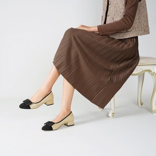olomisa Women's Pumps, Round Closed Toe Dressy Shoes, Bow Chunky Heel Patent Leather Slip On Pumps