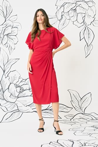 • Boat neck, short flutter sleeves, side drape, faux wrap detail on skirt at waist seam, and below the knee skirt length., Elegant boat neck dress with short flutter sleeves, side drape, and faux wrap detail at waist seam. Below-the-knee length outstanding for cocktail, wedding guest, or formal occasions. Versatile style suitable for evening events or as a bridesmaid dress.