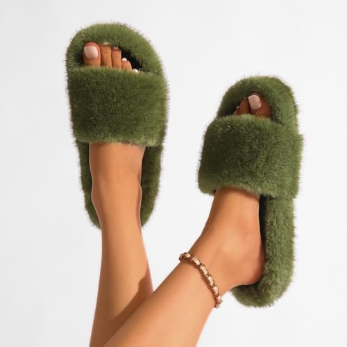 Women's Fuzzy Fluffy Furry Fur Slippers Flip Flop Open Toe Cozy Faux Fur Slip-On With Rubber Soles Shoes 6
