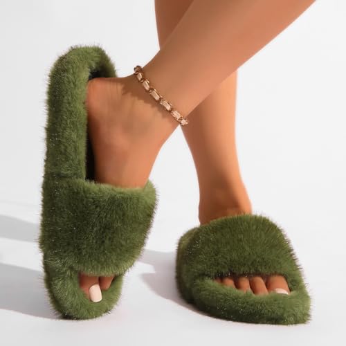 Women's Fuzzy Fluffy Furry Fur Slippers Flip Flop Open Toe Cozy Faux Fur Slip-On With Rubber Soles Shoes 7