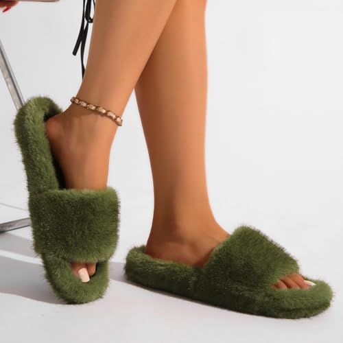 Women's Fuzzy Fluffy Furry Fur Slippers Flip Flop Open Toe Cozy Faux Fur Slip-On With Rubber Soles Shoes 5