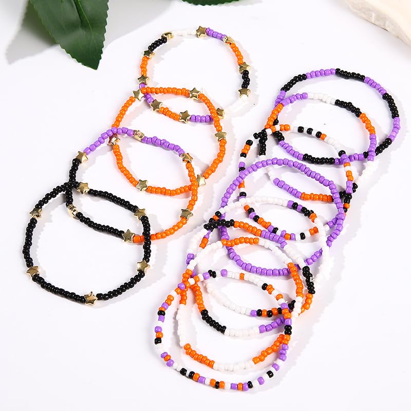 • Vibrant Halloween Colors: This set of 12 seed bead bracelets features a layered silhouette in black, purple, and orange, outstanding for spicing up your Halloween costume look. The elasticated rope makes them ideal for easy layering and a pleasant fit.