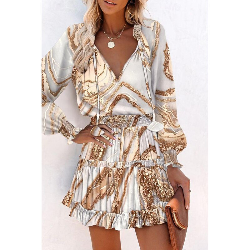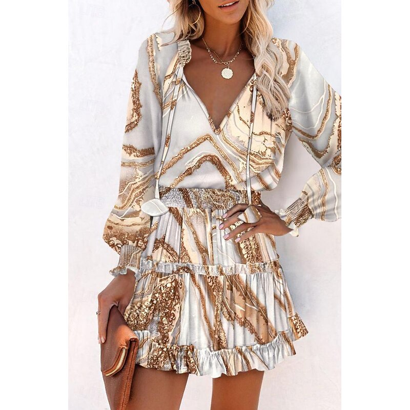 Highlights - Stay cool and new-age all summer long in this polyester mini dress with long sleeves - Perfect for everyday wear, this women's dress features a trendy print design - Flattering V-neckline adds a feminine touch to your look - Versatile piece that is great for daily occasions - Elevate your wardrobe with this petite dress that hits above the knee