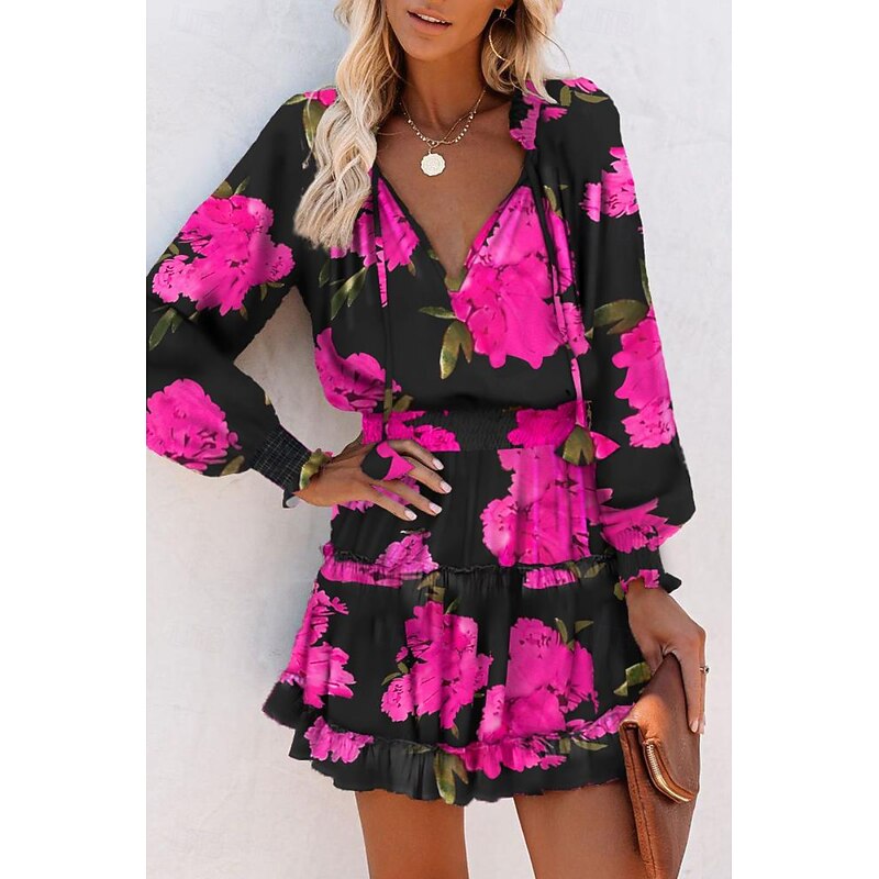 Women's Mini Dress Petite Dress Print Dress Fashion Daily Holiday Going out Regular Fit Flower Long Sleeve V Neck Black Red Khaki Rose Red Summer 14