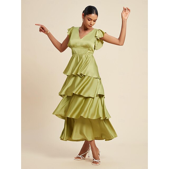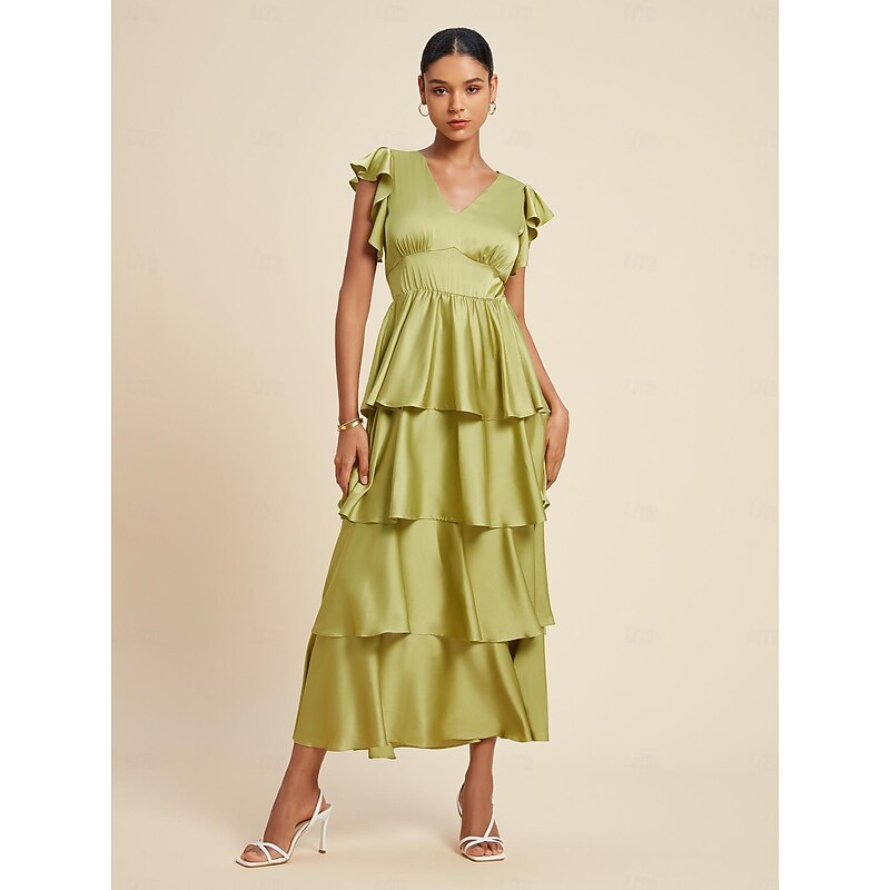 popular ! Satin Ruffle V Neck Maxi Dress