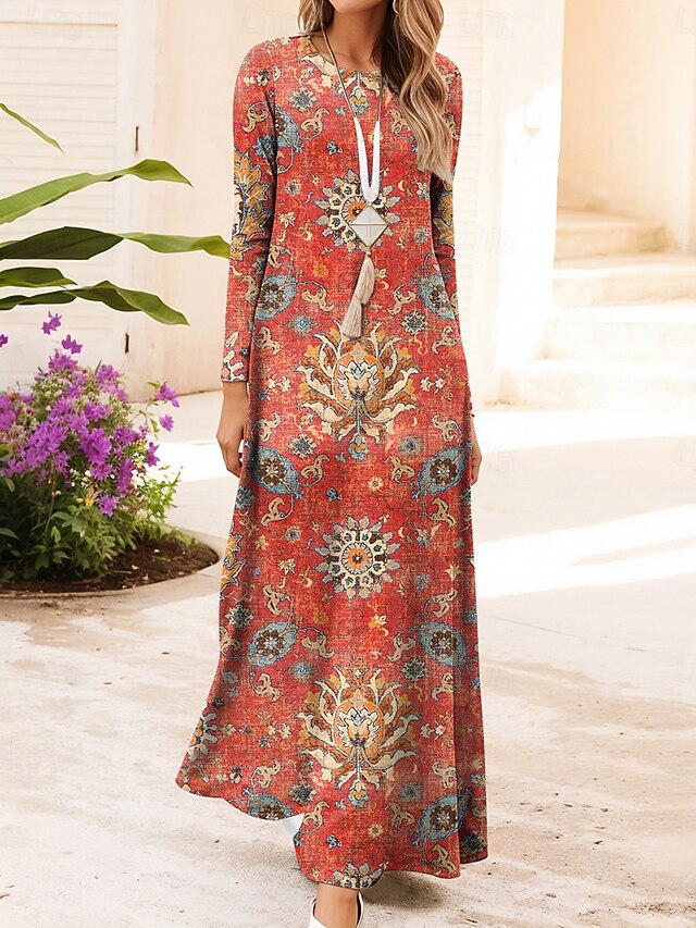 popular ! Women's Maxi Dress Vintage Bohemian A Line Dress Crew Neck Long Sleeve Casual Daily Regular Fit Graphic Geometric Dark Red Red Blue Brown Summer Spring Fall Winter