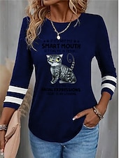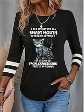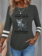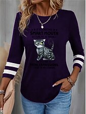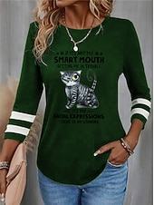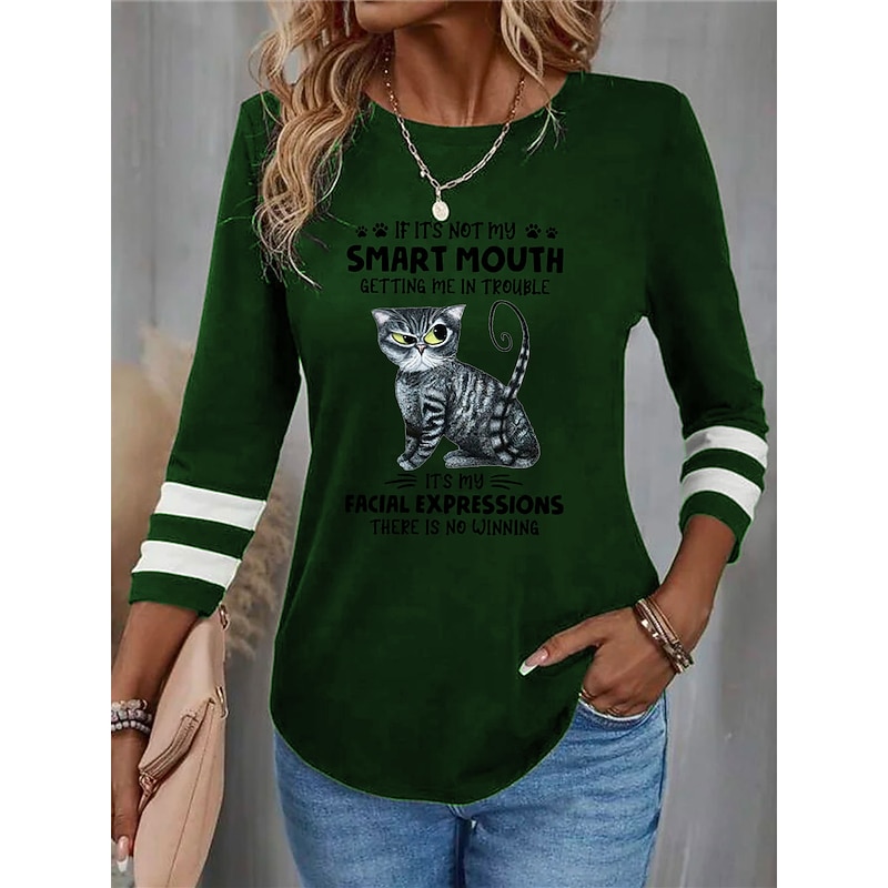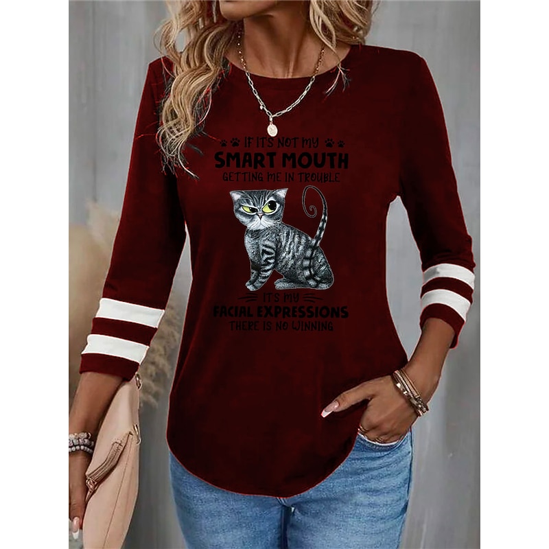 Women's T shirt Crew Neck Long Sleeve Tunic Cat Letter Funny Round Neck Regular Tops Daily Weekend Print Black Red Blue Purple Green Spring & Fall