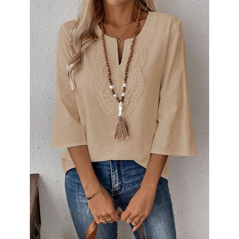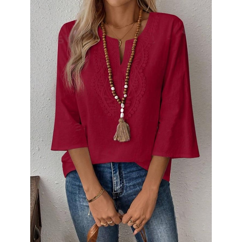 Why Choose Women's Lace Shirt Solid Color trendy Casual 3/4 Length Sleeve V Neck Regular Tops Daily Lace Patchwork White Red Blue Gold Summer Spring?
