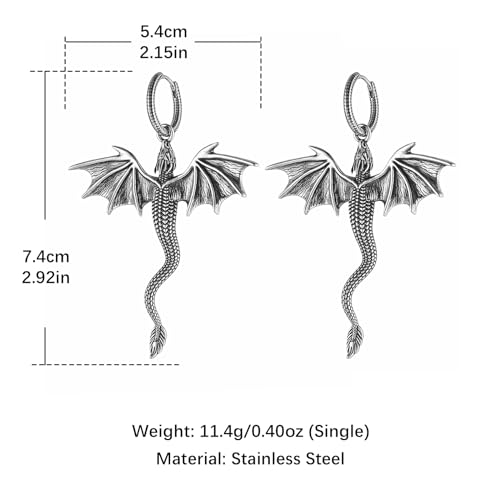 Material: Stainless SteelMetal type: Stainless SteelBack Finding: Hinged HoopEarring design: DangleGem type: No GemstoneItem type name: Dangle EarringsDragon Earring: Retro gothic punk dragon design, classic simplicity. Every detail has been polished, authentic to the touch and extremely visual, comfortable to wear and a great choice for a club or Halloween party.Materials: Made of high-quality stainless steel with a delicate pattern that does not fade, hypoallergenic, rust, deform, making this earring durable and suitable for long wear without damaging the skinSize: The dragon earrings measure 5.4cm x 7.4cm / 2.15in x 2.92in and single weight 11.4g, making them lightweight and comfortable to wearPerfect Gift: Earrings comes with a attractive gift box. This is the perfect gift for a friend, family member husband boyfriend father or yourself. Whether it's a halloween, party, Christmas, or any special event, this earring is a perfect accessoryService: If there are any problems with the purchase, please feel free to contact us, we will reply within 24 hours in working days. Perfect for everyday use. supreme materials and excellent craftsmanship ensure long-lasting durability.