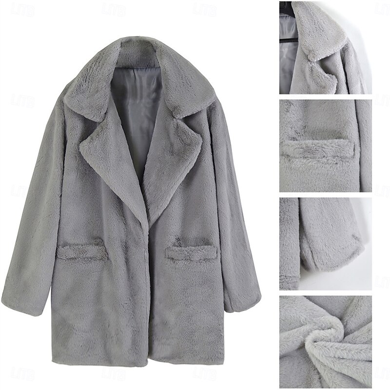 Highlights [Fabric and Material] : This womenβs faux fur coat is crafted from luxurious, plush faux fur that provides both warmth and breathability. The micro-elastic fabric ensures a comfortable fit while maintaining style and functionality. [Fit and Style] : Featuring a regular fit, this coat is designed for a relaxed look that allows for easy layering. The long sleeves and mid-thigh length offer additional warmth and coverage, making it an essential piece for the fall and winter seasons. [Design Highlights] : The coat showcases a enduring turndown lapel collar and a single-breasted placket with a single button closure, adding a sophisticated touch. Functional pockets and a cozy fleece lining enhance its practicality, while the plain design keeps it versatile and timeless. [Occasions] : Ideal for daily wear, vacations, street outings, and going out, this coat transitions seamlessly from casual to more formal settings. Perfect for adding a touch of elegance and comfort to any outfit, it's a versatile choice for various occasions. [Size Range] : Available in sizes S, M, L, and XL, this faux fur coat is designed to suit a wide range of body types, ensuring a perfect fit for everyone. Choose from the sophisticated color options of gray and khaki to complement your wardrobe. Perfect for everyday use. first-class materials and excellent craftsmanship ensure long-lasting durability.