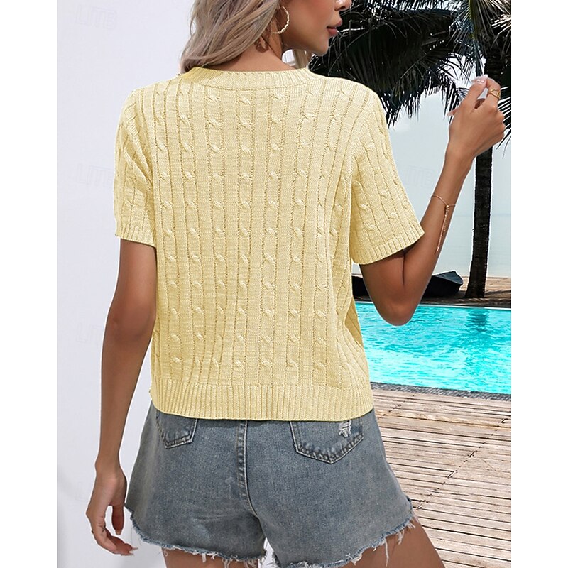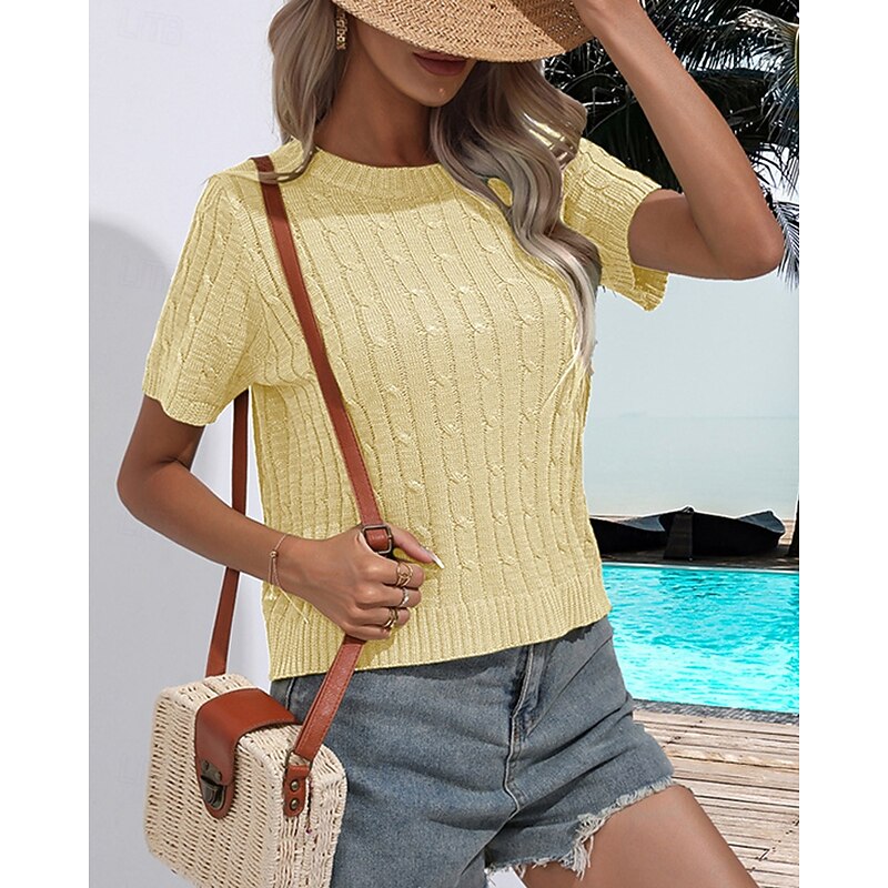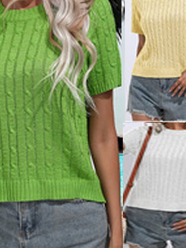 More information about Women's Pullover Casual Solid Color Chunky Crew Neck Knitted Short Sleeves Regular Tops Knit Daily Holiday Going out White Yellow Summer