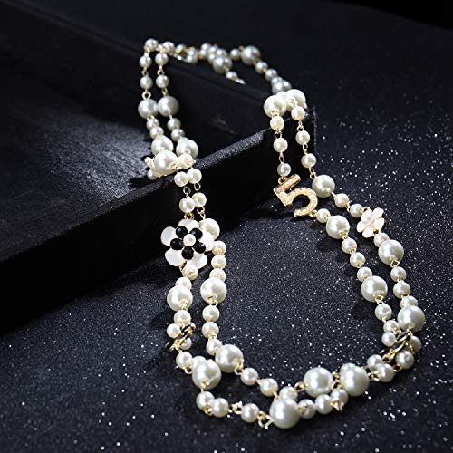 Fashion Jewelry Designer Pearl Camellia Necklace for Women Number 5 Long Double Stranded Necklace Birthday or Holidays Gifts 5