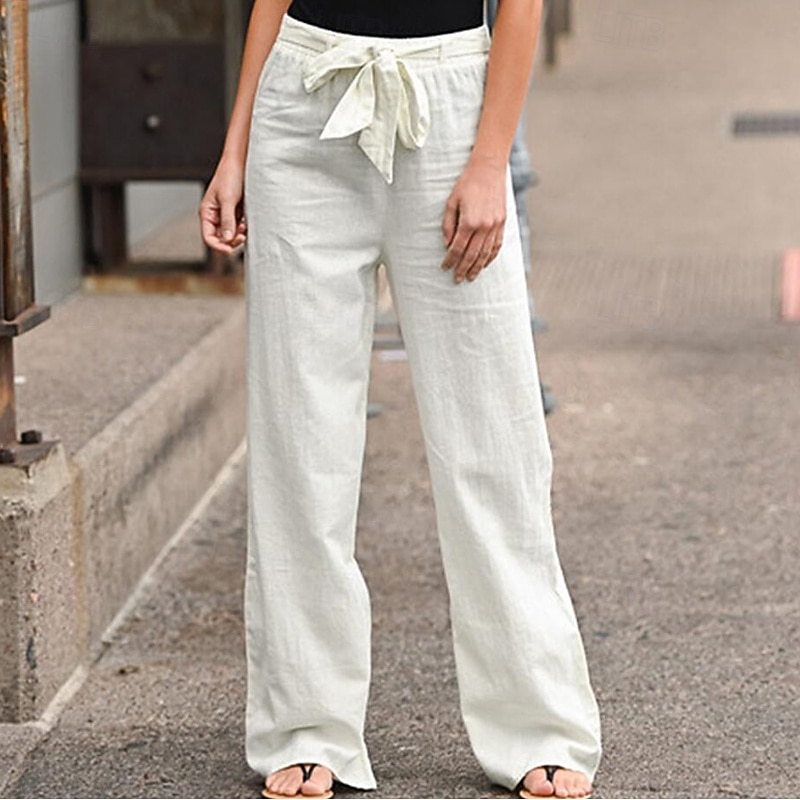 popular ! Women's Cotton Linen Pants Slacks Palazzo Pants Streetwear Casual Full Length Natural Plain Elastic Drawstring Design Comfy Outdoor snug Daily Wear Going out Grey Black White Yellow Summer