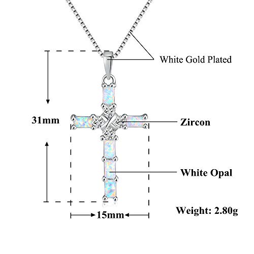 Material: StoneMetal type: White gold-plated-brassClasp type: BallChain type: BoxGem type: Created-white opalCross pendant necklace made of 18k white gold plated brass and created fire opal, hypoallergenic, comfort fit and no harmfulTotal chain length is 18 inches, pendant length: 1 1/4, pendant width: 15 mm, weight: 2.81 g. the main stone of the pendant is created white fire opal 4 x 2 mm x 6 pcs, zircon 1 mmLuxury gemstone cross pendant necklace. This opal necklace is the perfect surprise! This religious jewelry for women displays an oval-cut cross created white fire opal gemstone pendant with white topaz accents. Opal cross necklace enhances your daytime and evening attire. It can be purchased as religious gifts for womenThis opal cross pendant necklace comes in a attractive leatherette gift box. Perfect as a simple romantic present, suits for wife, lover, fiancee, friend. And suitable for Valentine’s Day, Christmas’ Day, Mother’s Day, Holiday, Ball, Party, Anniversary, Prom, Graduation, Birthday or any special occasionsAfter Sales: We insists on selective product development and strict quality control, if you receive a defective product, please let us know and our friendly customer support team will be ready to help you Perfect for everyday use. supreme materials and excellent craftsmanship ensure long-lasting durability.