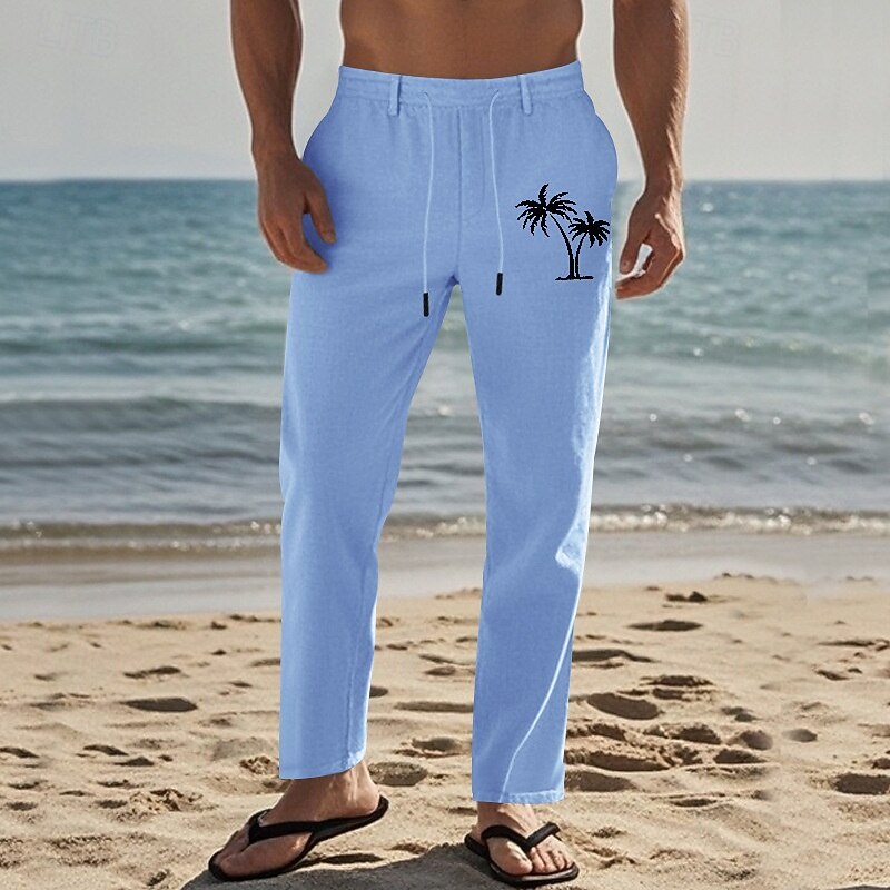 More information about Men's Linen Pants Trousers Summer Pants Beach Pants Drawstring Elastic Waist Straight Leg Coconut Tree Comfort Breathable Full Length Daily Holiday Beach Vacation Fashion Black White
