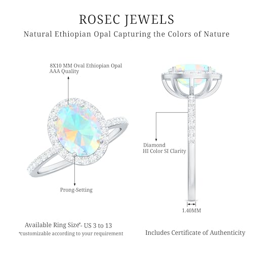 Ring size: 3Item width: 7.5 millimetersMaterial: 10K Solid Gold, Diamond, Ethiopian OpalMetal type: White GoldGem type: Diamond, Ethiopian OpalItem type name: Engagement RingsThe Opal Halo Engagement Ring exudes fiery, mystical beauty that shines from every angle. The stunning Oval Cut Opal is beautifully framed by a halo of Diamond, adding brilliance and enchantment to create a truly captivating symbol of love.100% Natural and Certified Opal symbolizes Passion - Wearing this gemstone will strength your will to live and balance your energy to rebuild. Ethiopian Opal is the gemstone for the October born.Quality Assurance- 10K Solid Gold; Ethiopian Opal Quality: AAA ; Total Ethiopian Opal Carat : 1.33 (Approx.); Diamond Quality: Hi-Si ; Total Diamond Carat : 0.52 (Approx.)Safe and Secure Packaging - All of our jewelry item arrives in high-end signature jewelry boxes, ensuring they are ready for proposals/gifting purposes so that you don't have to spend any time packing them. To assist you in avoiding unnecessary hassle, we provide our ring sizing kit to you.Shop with Confidence - Rosec Jewels assures you to get Peoples heads turned with our sparkling jewelry pieces which are authentically certified just for your peace of mind. sku:-RCRI0821199160 Perfect for everyday use. supreme materials and excellent craftsmanship ensure long-lasting durability.