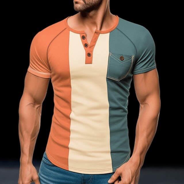 More information about Men's Button T Shirt T Shirt Henley Shirt Tee Top Short Sleeves Henley Summer Color Block Fashion Designer Basic Vacation Street Going out Pink Blue Orange Top Tee for Men
