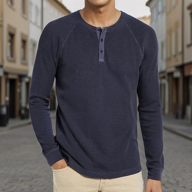 Highlights Highlights for Men's Waffle Henley Shirt [Fabric]: Crafted from a breathable polyester blend, this men's Henley shirt offers micro-elasticity for enhanced comfort and a lightweight feel. The classic waffle knit texture adds a sophisticated element to its design. [Fit]: Designed with a regular fit, this shirt provides a flattering silhouette suitable for layering or wearing on its own. The slim-fit style enhances your shape while ensuring ease of movement. [Design Highlights]: The deep navy blue color provides a versatile base that pairs effortlessly with various outfits. The Henley neckline is accentuated by a refined three-button placket, offering adjustable styling options and a touch of modernity. [Occasions]: Perfect for vacation getaways, casual street wear, or everyday outings, this shirt embodies effortless style and comfort. Whether enjoying leisurely weekends or casual gatherings, it suits a wide range of informal occasions. [Size Range]: Available in sizes S through XXL, ensuring a comfortable fit for various body types. With a selection of colors including navy blue, brown, black, gray, wine, and blue, you'll find the perfect match for your personal style. Perfect for everyday use. excellent materials and excellent craftsmanship ensure long-lasting durability.
