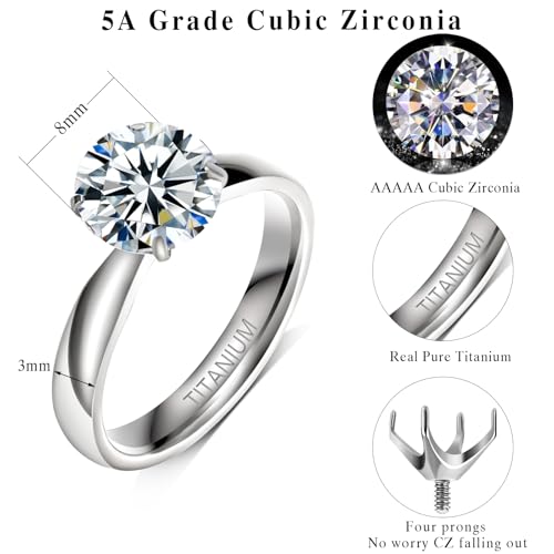 • BRILLIANT AAAAA CZ: Pure titanium engagement ring for women is crafted with the 0.9 ct (6mm) Cubic Zirconia and features a band measuring at 3mm in width