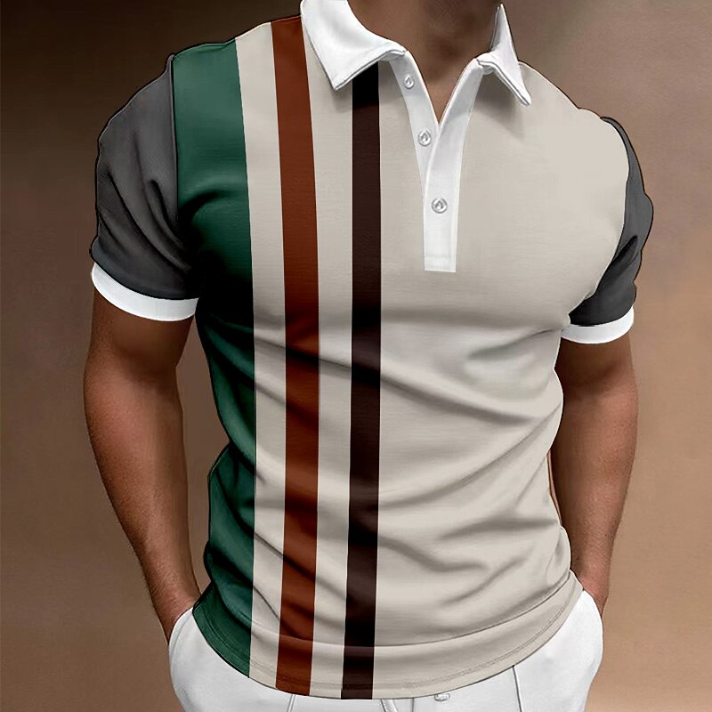 Highlights [Fabric] Crafted from a high-quality polyester blend, this men's polo shirt offers a soft and breathable fabric that's perfect for keeping cool during summer. The material's micro-elasticity provides both comfort and durability, ideal for daily wear. [Fit] Designed with a regular fit, this polo shirt offers a flattering silhouette while ensuring ease of movement. It's tailored to suit a variety of body types, making it a versatile wardrobe staple. [Design Highlights] Featuring a new-age color-block pattern, the shirt is adorned with vertical stripes in neutral tones like gray, brown, and beige for a sophisticated look. The white cuffs and collar add a classic touch, while the button-up placket completes the timeless polo design. [Occasions] Suitable for a range of occasions, this polo shirt is perfect for casual outings, holiday getaways, or relaxed leisure activities. Its modern yet comfortable design makes it an excellent choice for both everyday wear and special gatherings. [Size Range] Available in a range of sizes from S to 3XL, this polo shirt caters to various body shapes and preferences, ensuring an accommodating fit for all. Choose from an array of colors including blue, green, red, and gray to match your personal style.