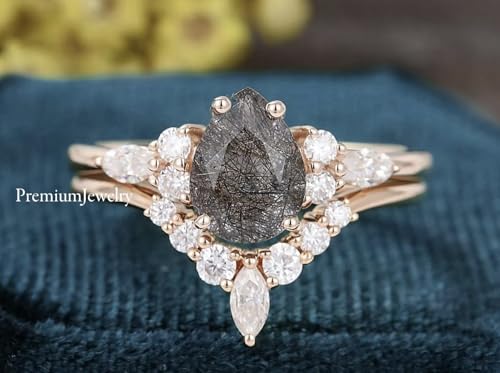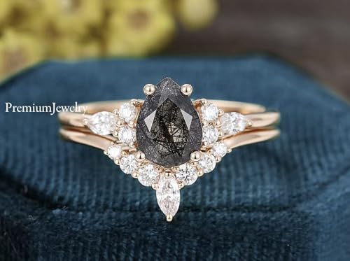 popular ! Pear Shaped Black Rutilated Quartz Ring & Curved Band, Delicate Cz Engagement Ring Set of 2, Wedding Ring Set for Women, Christmas Gift, Bridal Ring, 925 Sterling Silver Ring