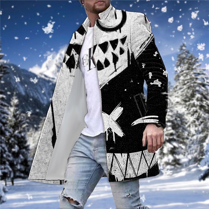 Highlights [Fabric:] Crafted from a high-quality blend of synthetic fibers and wool, this men's winter coat ensures warmth and comfort in chilly weather. The lining provides extra insulation, making it ideal for colder months. [Fit and Style:] With a tailored fit, this long overcoat offers a structured silhouette that complements the up-to-date man's wardrobe. The single-breasted design adds a touch of enduring style while allowing for easy layering. [Design Highlights:] This coat stands out with its vibrant geometric and abstract print available in colors like blue, green, white, orange, and red. The turndown neckline adds an elegant touch, while the long sleeves are designed for ease of movement, balancing fashion with functionality. [Occasions:] Perfect for going out or weekend outings during the fall and winter seasons. Whether you're heading to a casual gathering or exploring snowy landscapes, this coat provides both warmth and style. [Size Range:] Available in a range of sizes from M to 3XL, ensuring a fit that suits various body types and preferences.