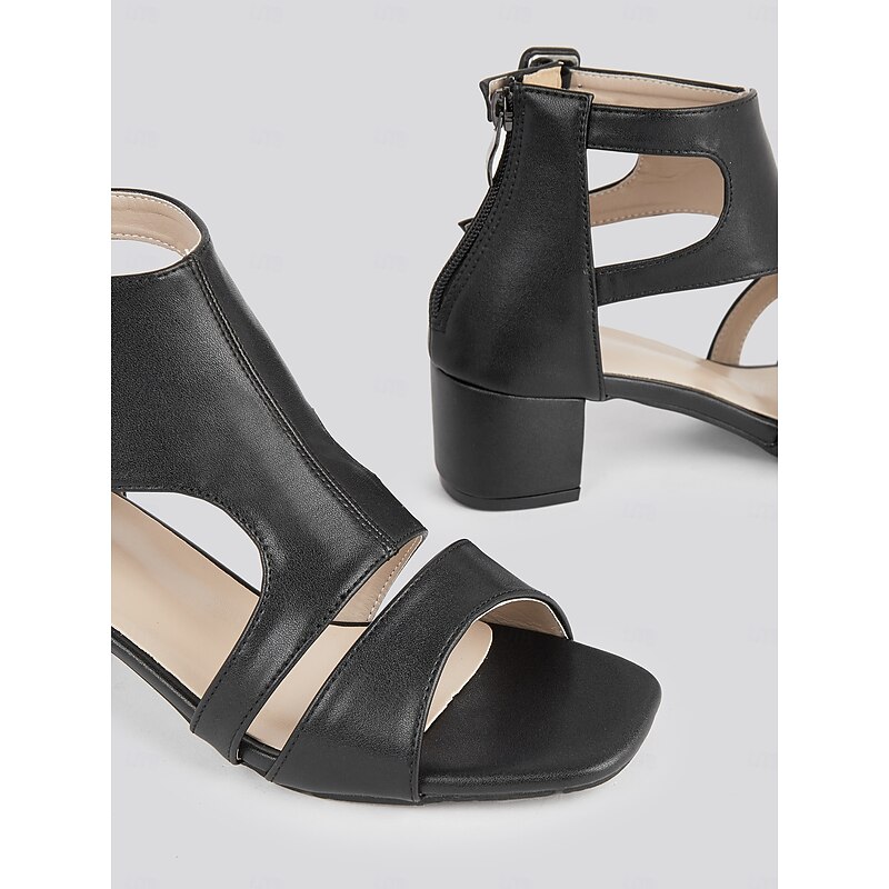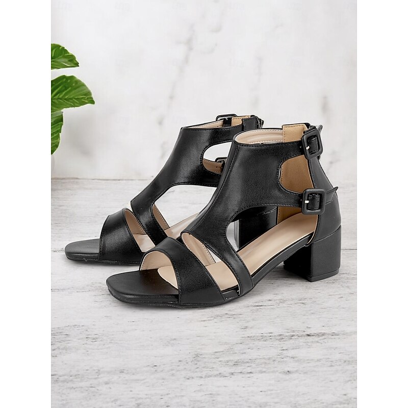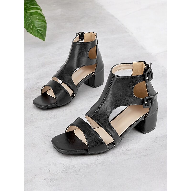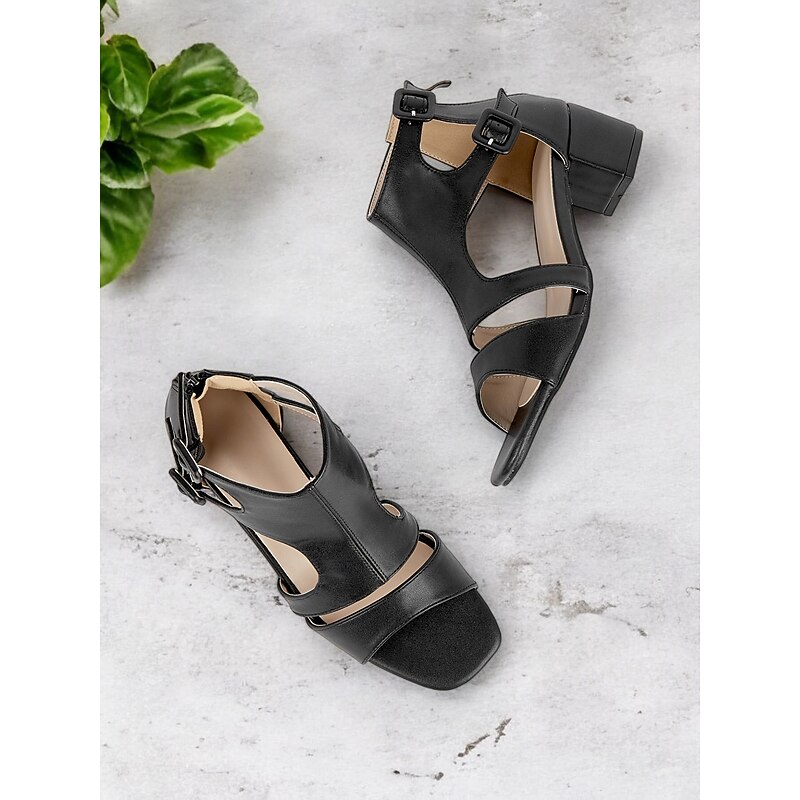 popular ! Black Faux Leather Cut-Out Block Heel Sandals for Women - Elegant Summer Work Shoes with Double Buckle Straps