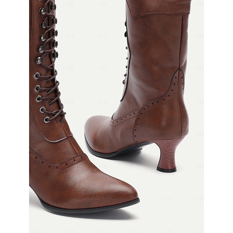 Women's Brown Victorian Lace-Up Boots with Mid Heel - Vintage-Style Retro Footwear for Cosplay, Events & Daily Elegance 1