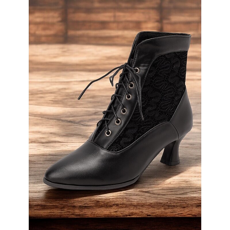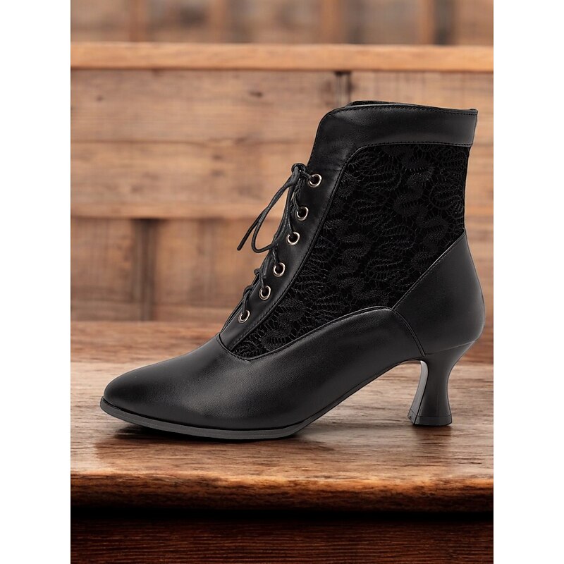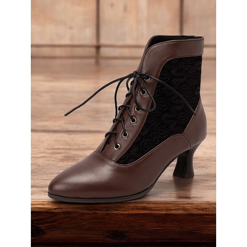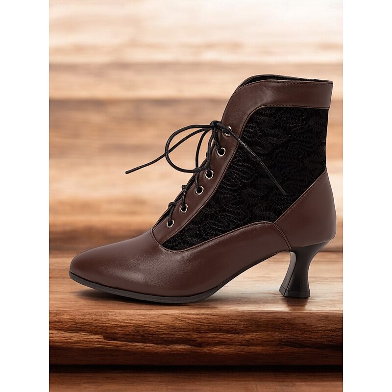 Highlights [Fabric] Crafted with sophisticated brown faux leather and intricate black lace panels, these boots offer a textured and visually appealing combination that adds an elegant touch to your ensemble. [Shape] Featuring a pointed toe and sleek, form-fitting silhouette, these ankle boots provide a graceful and vintage charm, ensuring they stand out whether paired with casual or formal attire. [Design Highlights] The lace-up front showcases a iconic Victorian-inspired look, complemented by a mid-height tapered heel that delivers both style and comfort. The detailed lace panels enhance the visual interest, making these boots a striking choice for any occasion. [Occasions] superb for all seasons—spring, summer, fall, and winter—these boots seamlessly fit into various settings. Ideal for daily wear or work environments, they elevate your outfit with a hint of vintage elegance. [Size] Available in a range of sizes from US5.5 to US10.5, these boots are true to size. Opt for your usual shoe size to enjoy a perfect fit.