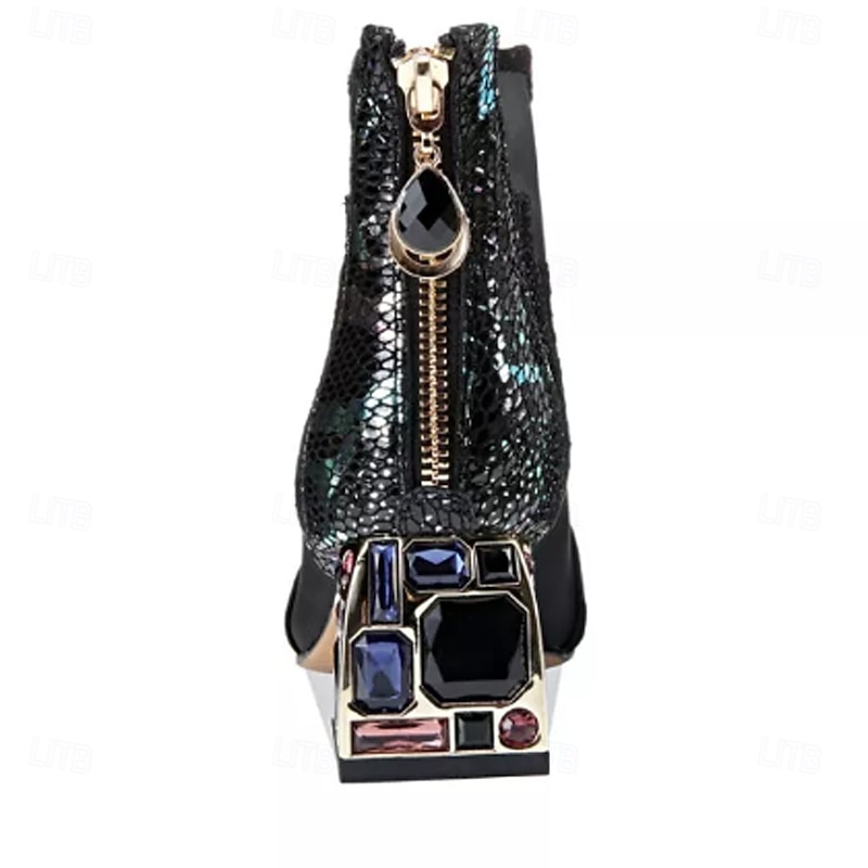 Highlights [Fabric] : The upper of these women's ankle boots is made from a breathable mesh fabric, perfectly complemented by durable PU leather at the toe and heel for added support and durability. [Fit] : Designed with a versatile block heel, these boots offer both comfort and style, providing a stable base that supports you through both casual outings and more formal occasions. [Design Highlights] : These boots feature a standout design element in the form of a rhinestone-embellished block heel. The geometric patterns on the heel add an artistic flair, making these boots both chic and eye-catching. A convenient zipper closure ensures easy wear, while the solid colored pattern provides a sleek, up-to-date finish. [Occasions] : Ideal for evening parties, special occasions, or as everyday wear, these mesh ankle boots add an edgy yet elegant touch to any outfit. Whether at the office or a night out, they transition seamlessly between settings. [Size Range] : Available in sizes 35 to 40, these boots cater to a wide range of foot sizes, ensuring a cushy fit for many wearers.