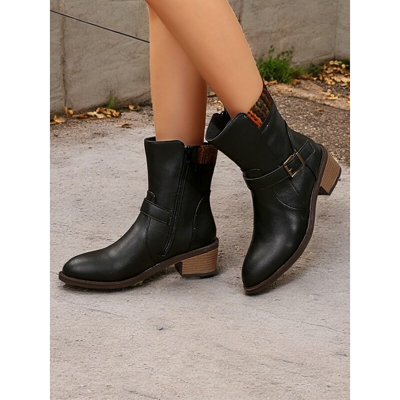 Women's Black Mid-Calf Boots with Buckle Straps and Colorful Knit Cuff – Casual Vintage Style for Everyday Wear