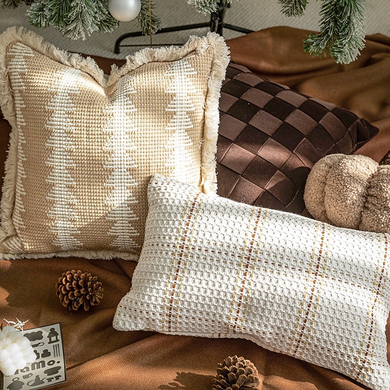 Nordic Christmas Style Beige and Brown Plaid Throw Pillow, Decorative Cushion for Living Room, Bedroom, Lumbar Pillow, Pumpkin Accent Pillow 14