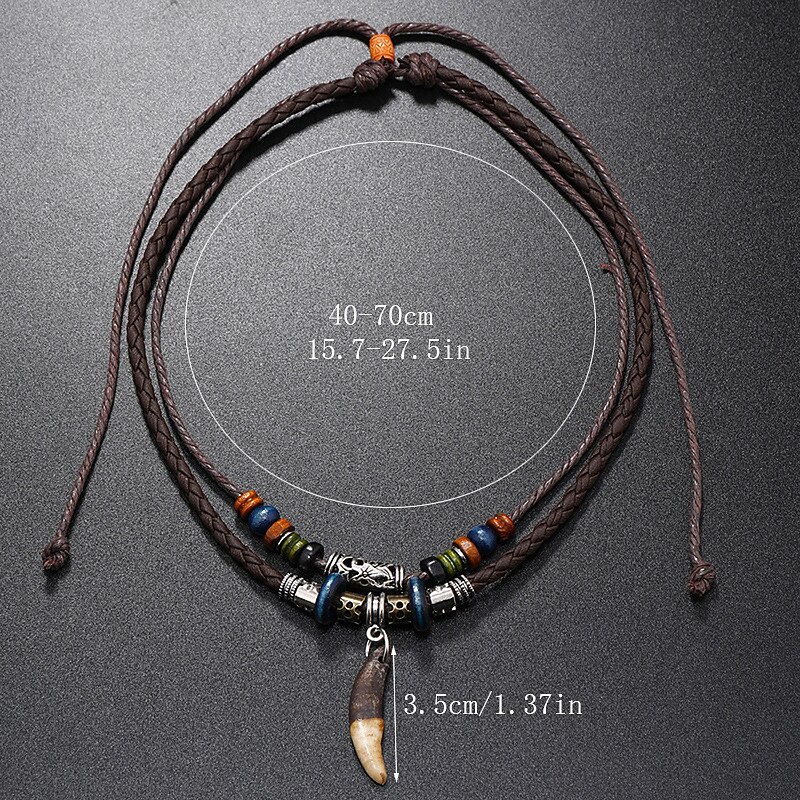 Highlights [Fabric:] Crafted from durable alloy and braided leather, this layered necklace integrates earthy and metallic tones for a robust yet sleek feel. The high-quality materials ensure longevity and wear resistance, making it an ideal companion for daily use. [Style and Fit:] Featuring a double-strand design with an adjustable clasp, this necklace can be comfortably customized to match a variety of necklines. The unique pendant and intricately carved centerpiece elevate its street-smart and elegant vibe, slotting into both men's and women's fashion effortlessly. [Design Highlights:] The bohemian-inspired design is accentuated by a decorative silver bead with intricate carvings and a striking pendant that mimics a tooth or horn. The combination of colorful beads and metallic silver spacers adds an element of sophistication, while braided leather cords offer a rustic charm thatβs both edgy and naturalistic. [Occasions:] Perfect for streetwear, daily use, or as a thoughtful gift. This necklace complements both casual and festival outfits, allowing it to seamlessly fit into a variety of settings, whether you're dressing up for a casual day out or accessorizing for a special occasion. [Size Suggestions:] With an adjustable design, the necklace offers versatile wearability suitable for various settings and preferences, ensuring a comfortable fit for different styles and tastes. Perfect for everyday use. excellent materials and excellent craftsmanship ensure long-lasting durability.