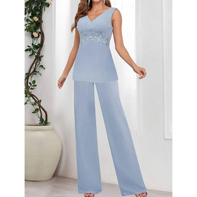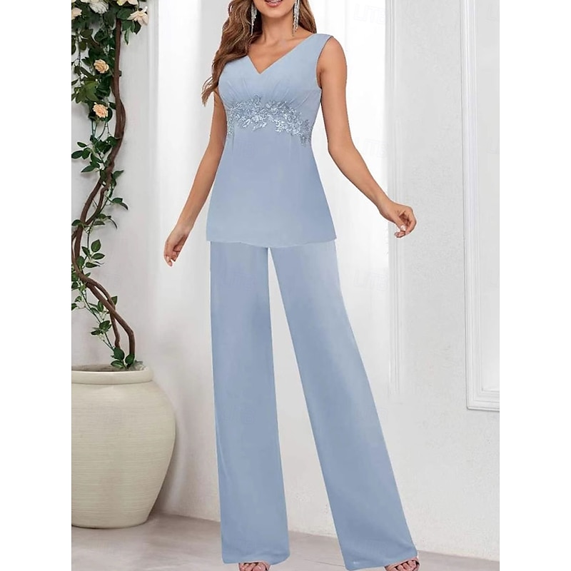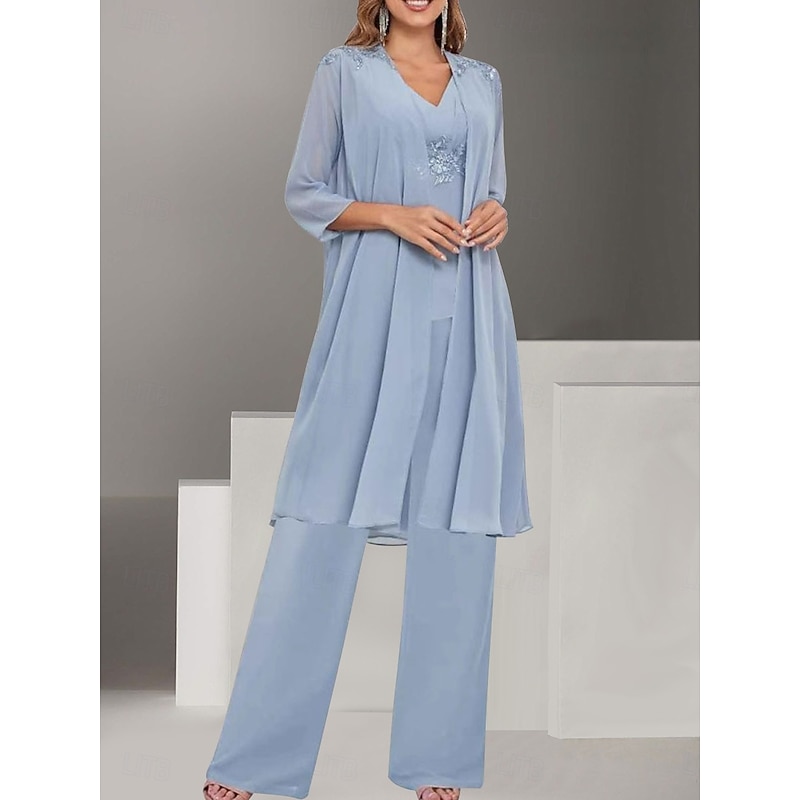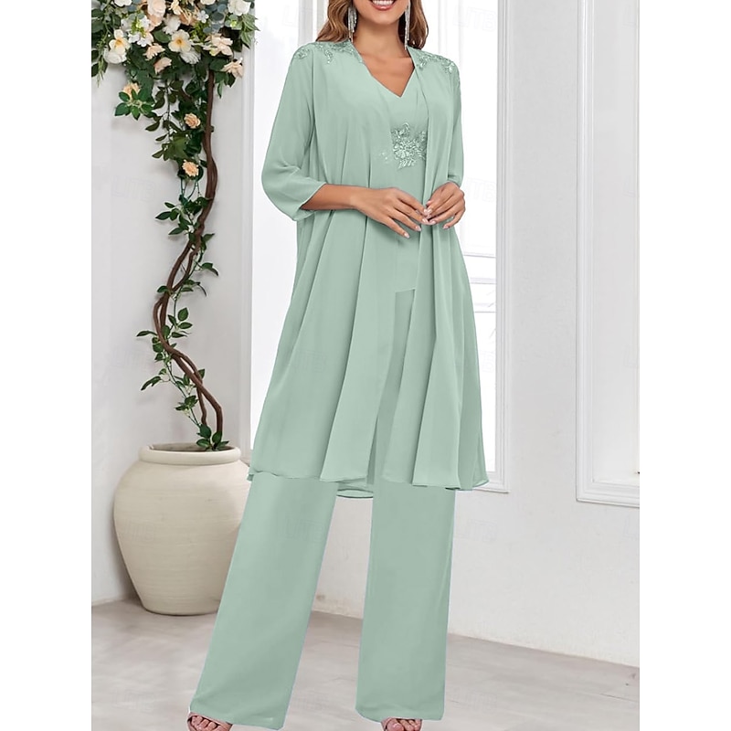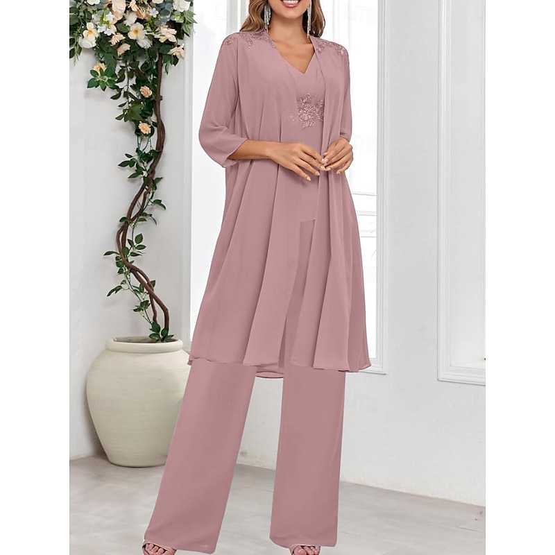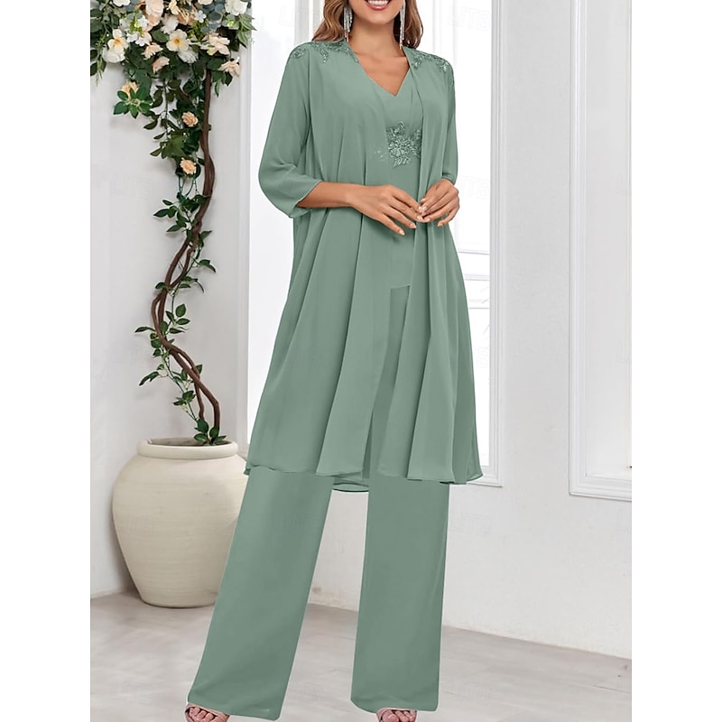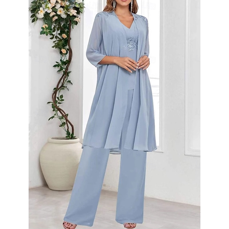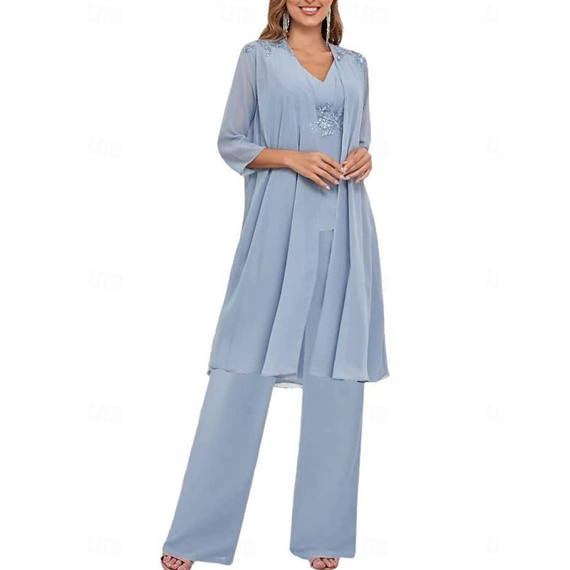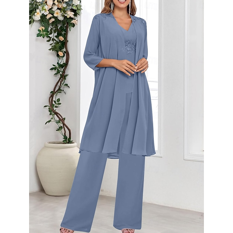 Why Choose 3 Piece Mother of the Bride Dress Wedding Guest Elegant straightforward V Neck Floor Length Polyester Long Sleeve with Solid Color?