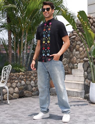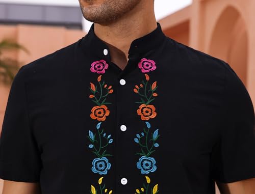 • Design: Mexican shirt for men, cinco de mayo shirt, short sleeve cuban collar shirt, single-breasted buttons at front, embroidered flowers at two sides, mexican dress shirts for men,casual button down short sleeve floral shirts for men, suitable for summer holiday.