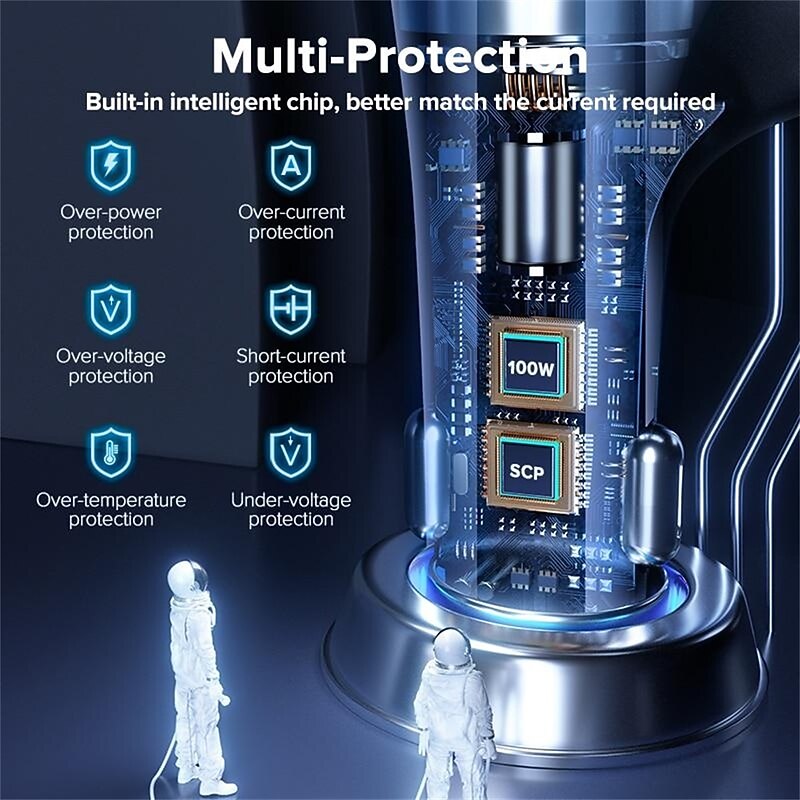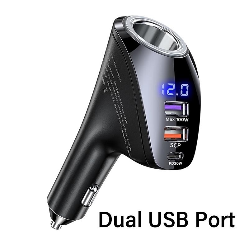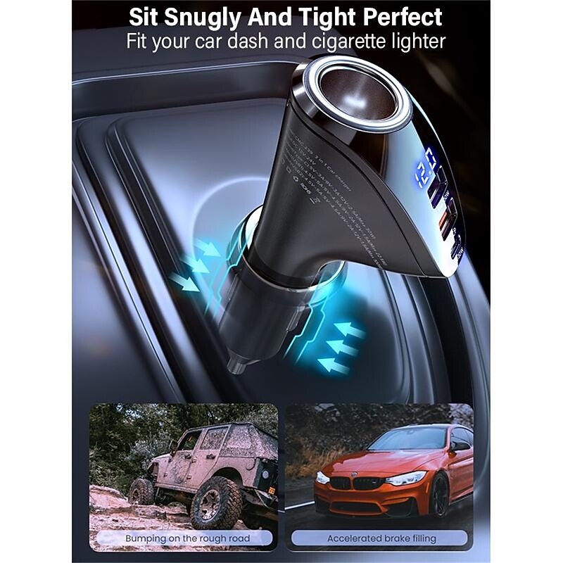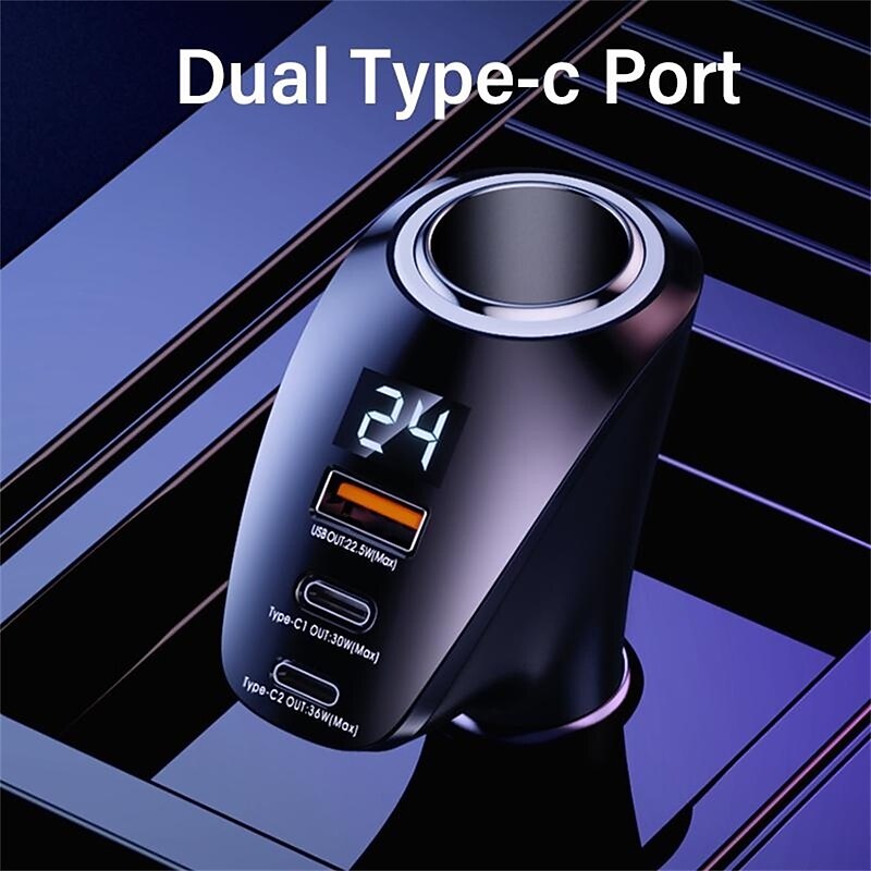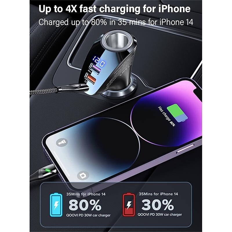 Highlights Product Selling Points: 1. Dual USB Port: The car charger features two USB ports with a maximum output of 22.5W. It supports various charging voltages and is compatible with different devices. 2. Dual Type-C Port: The charger includes two Type-C ports, each with a maximum output of 36W. It also supports multiple charging voltages and provides efficient charging for devices. 3. Three Output Ports: With three output ports, the charger allows for simultaneous charging of multiple devices, making it convenient for users with multiple gadgets. 4. Extended Cigarette Lighter Adapter: The charger comes with an extended adapter, allowing users to connect additional chargers and expand their charging capabilities. 5. Support for Fast Charging Protocols: The charger supports popular fast charging protocols, including QC2.0/QC3.0/AFC/FCP/SCP. This ensures fast and efficient charging for compatible devices. 6. Digital Display: The charger is equipped with a digital display that provides real-time monitoring of voltage, allowing users to keep track of charging status and make informed decisions. 7. High Power Output: The charger has a maximum output power of 100W, ensuring quick charging for devices that require higher power. 8. Wide Compatibility: The charger is compatible with various devices, including iPhones, Xiaomi smartphones, Samsung Galaxy phones, Huawei phones, and tablets like the iPad Pro and Air. Note: This product does not feature intelligent charge technology, and it does not use GaN (Gallium Nitride) material. It has been certified for quality and safety by ce, ROHS, and FCC. The charger is designed to be used in the car's lighter slot as a power source. Its model number is QOOVI 150W Car Charger, and it is made in Mainland China. faultless for everyday use. first-class materials and excellent craftsmanship ensure long-lasting durability.